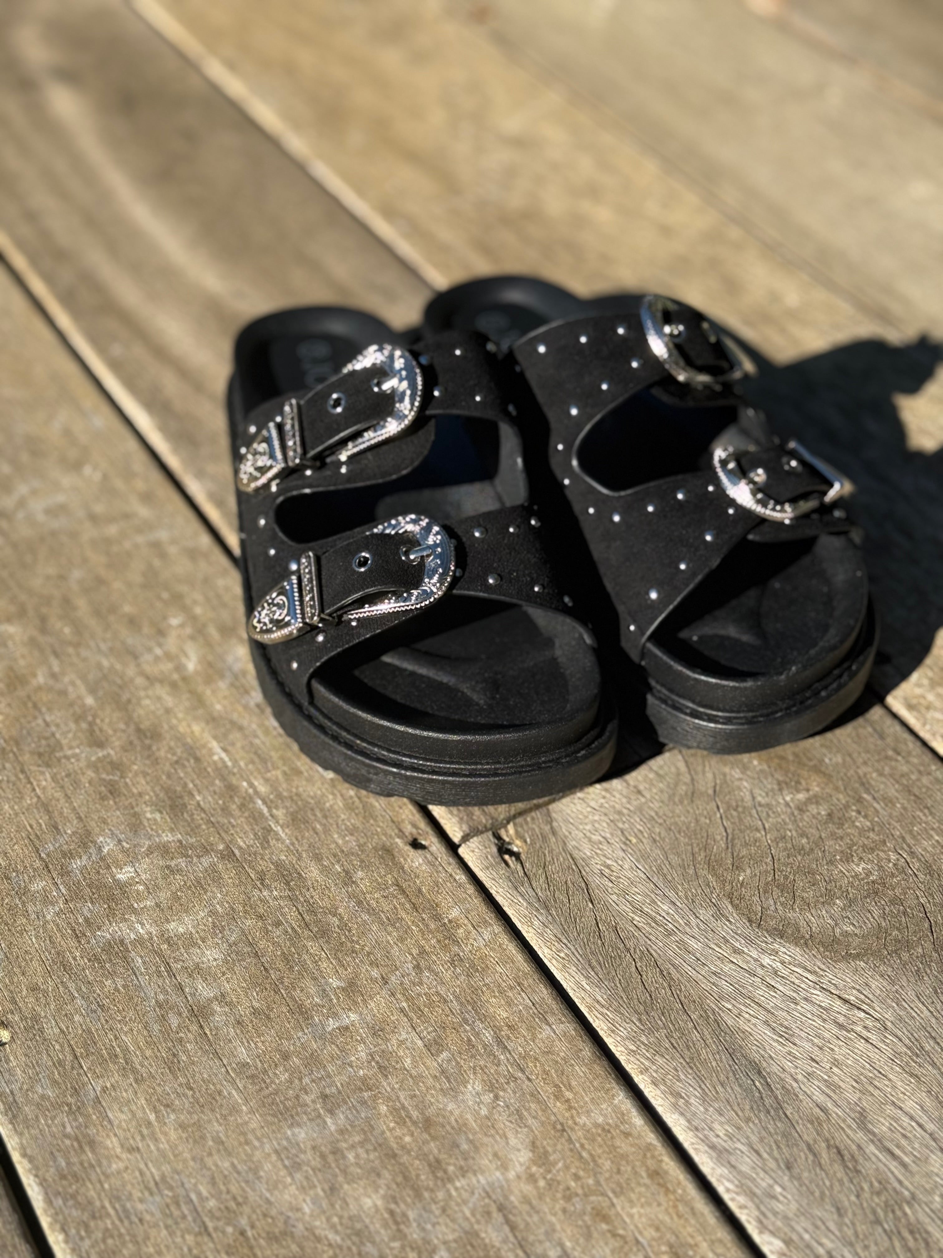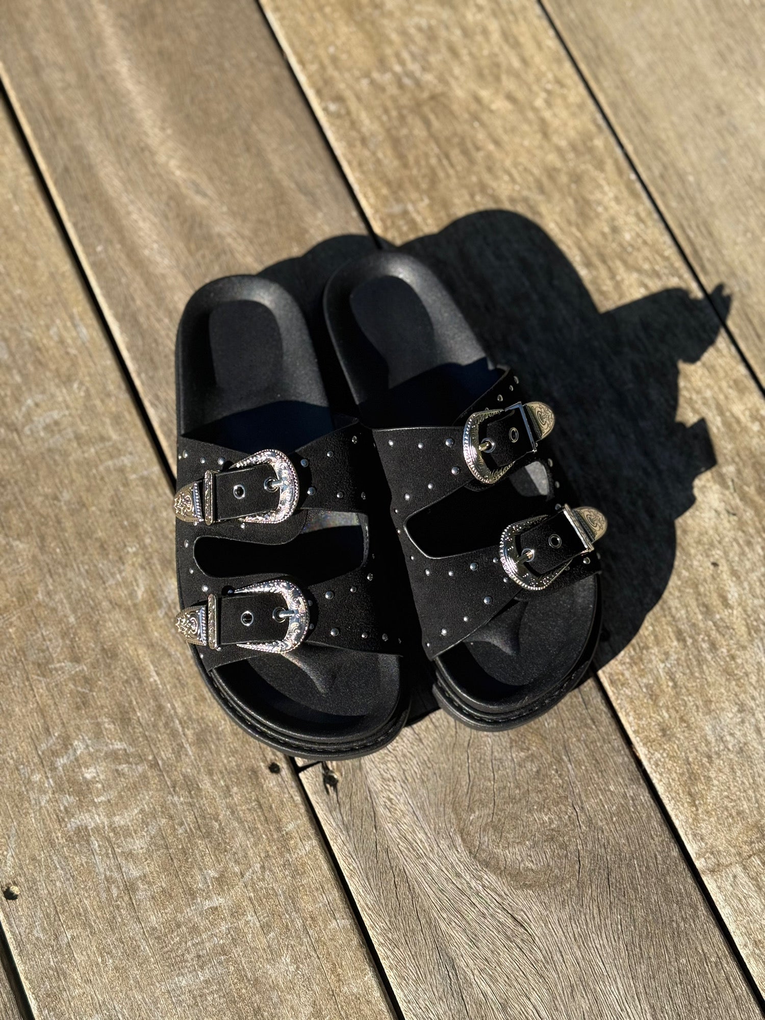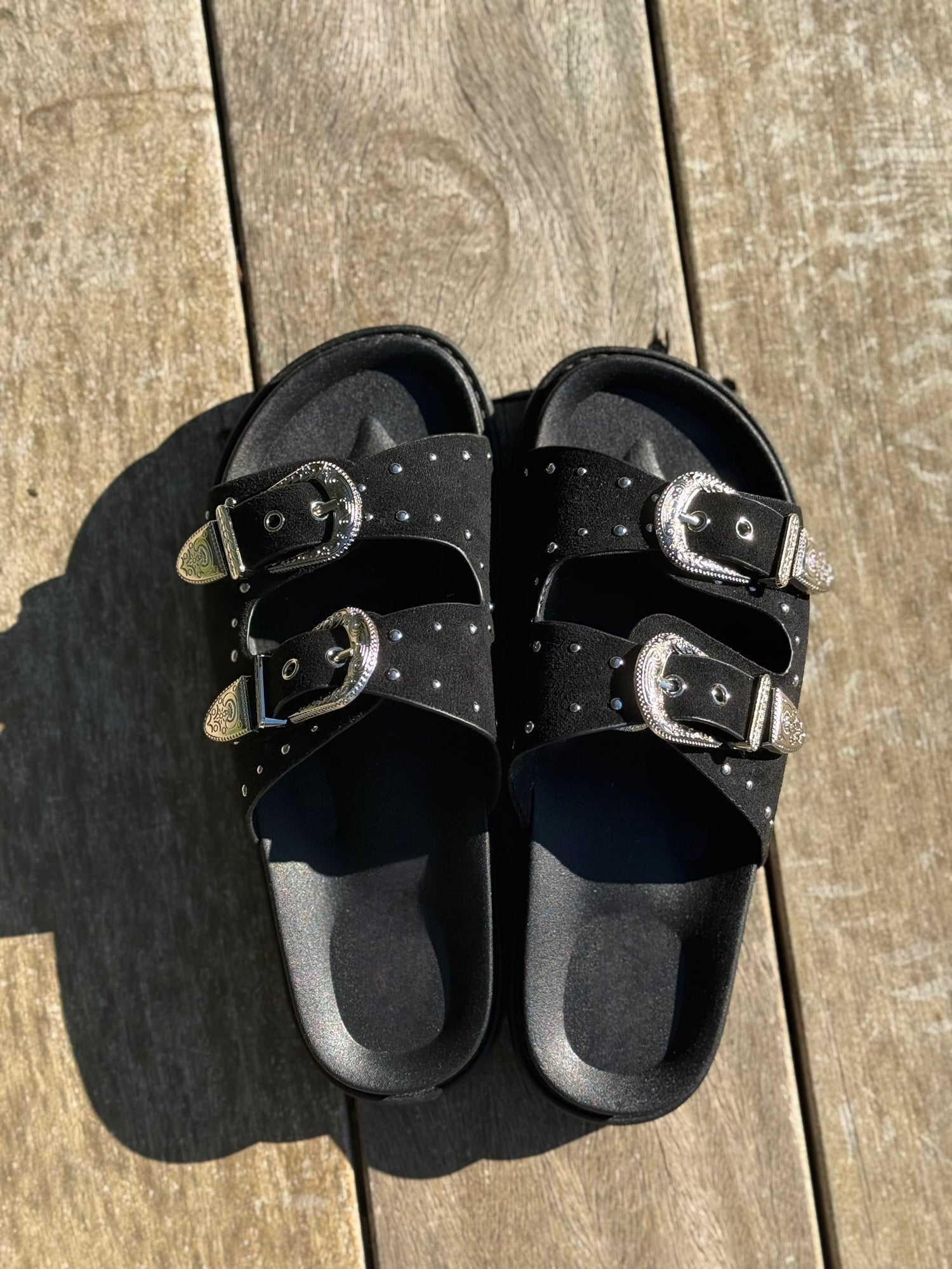- Brides larges ajustables avec boucles western gravées