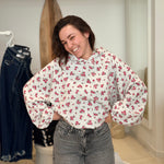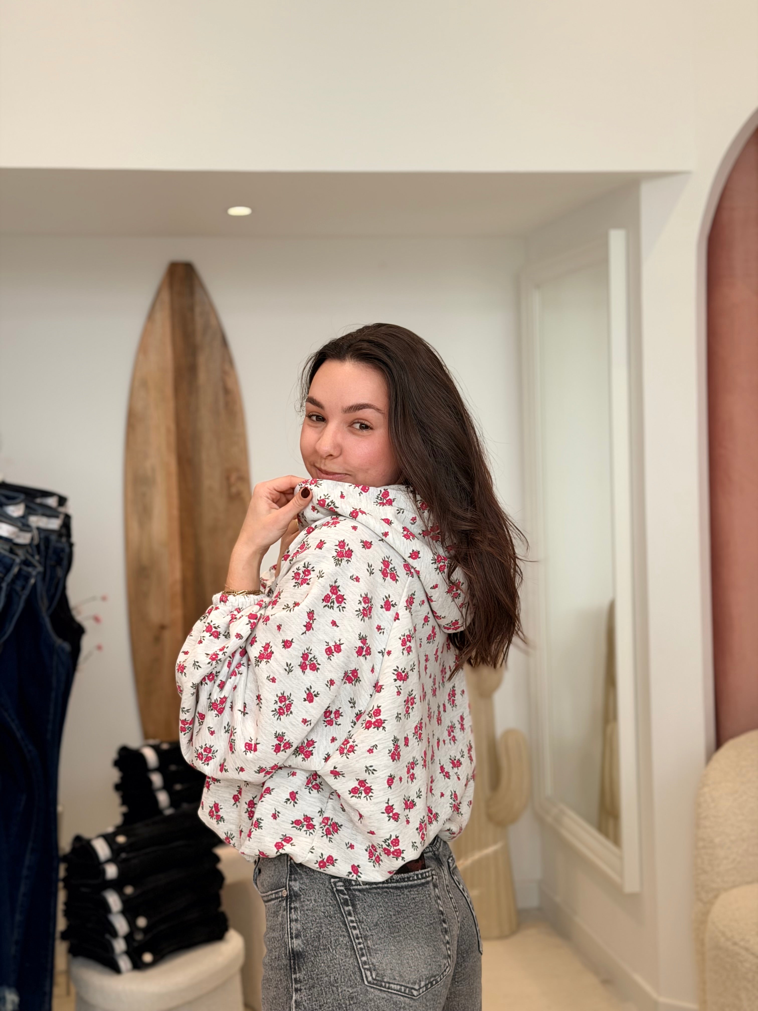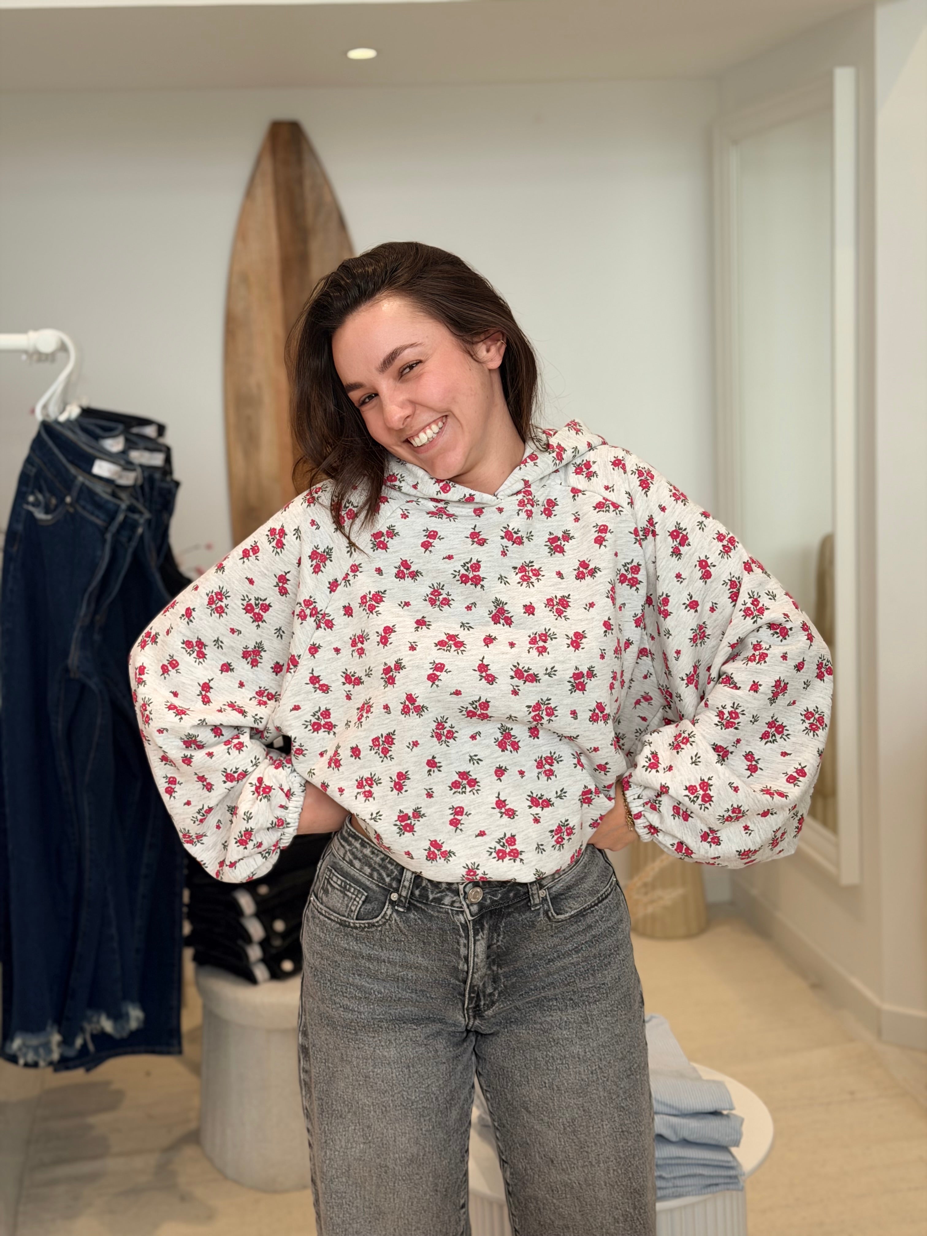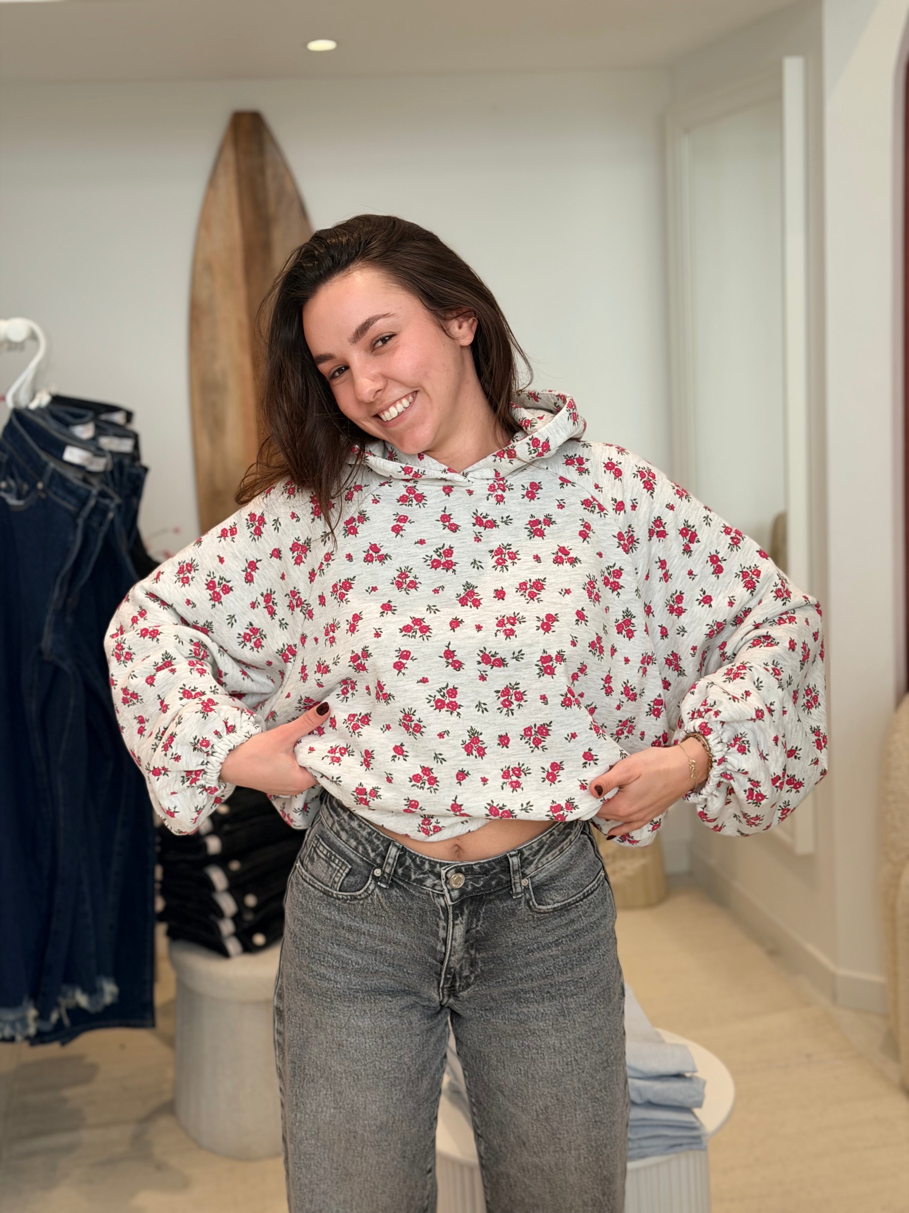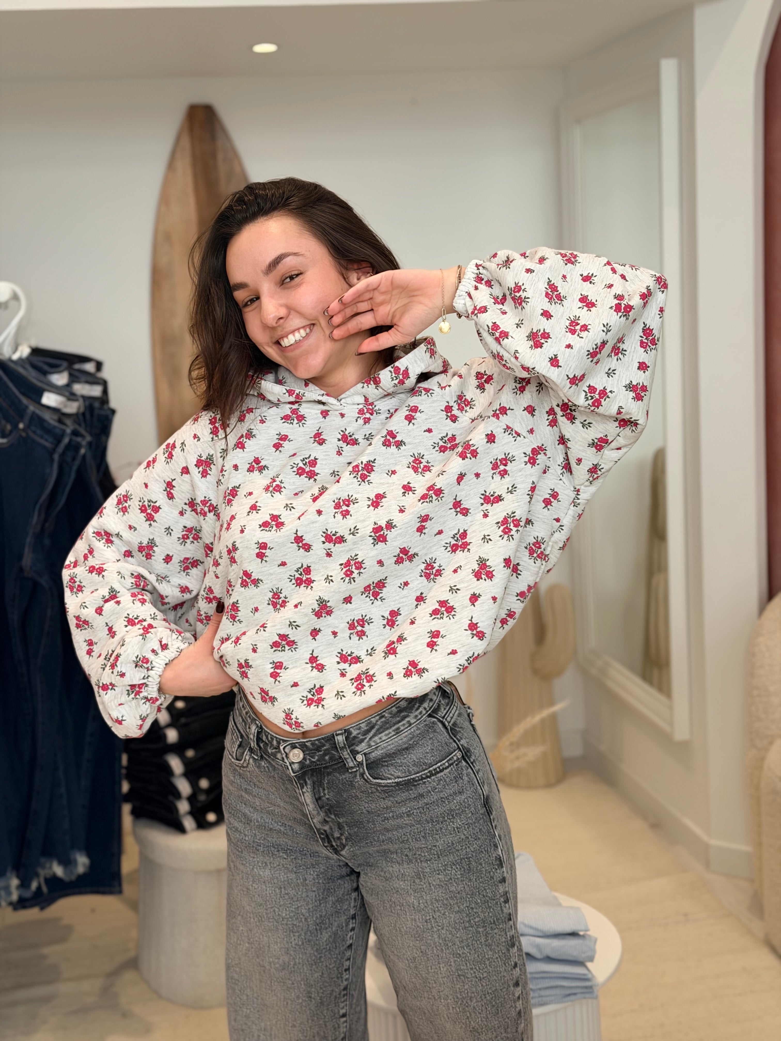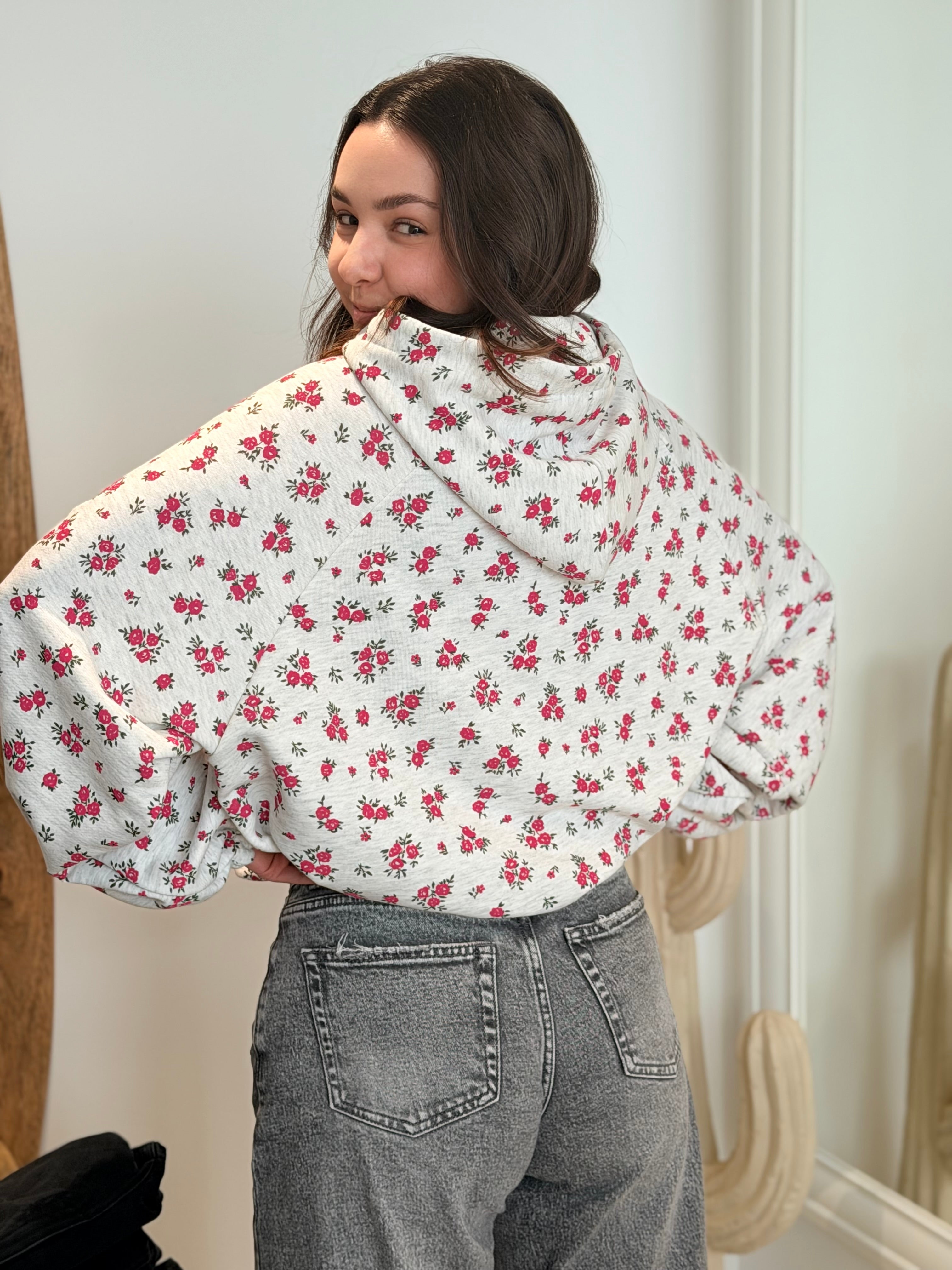 • Imprimés roses sur l'ensemble du pull