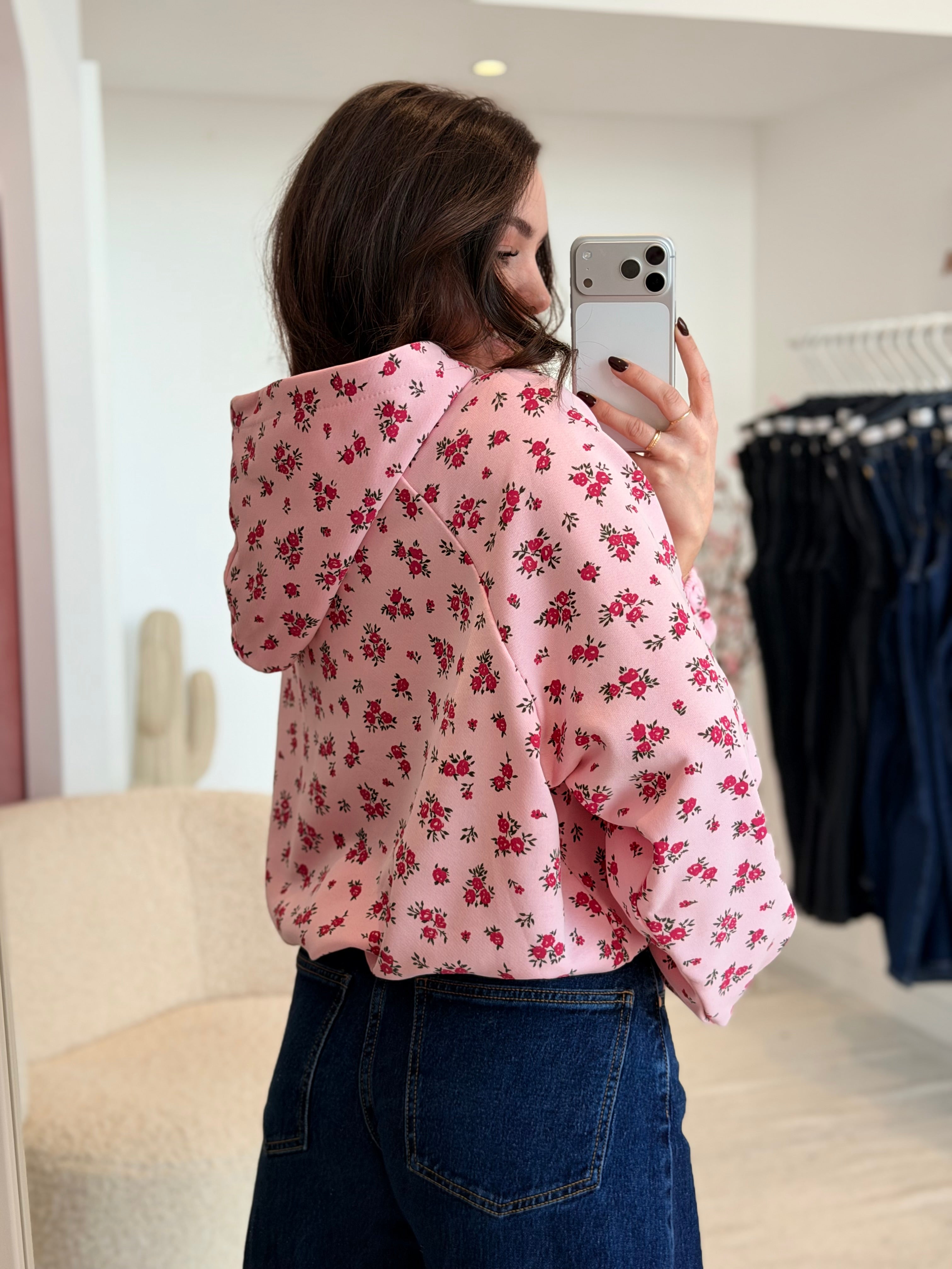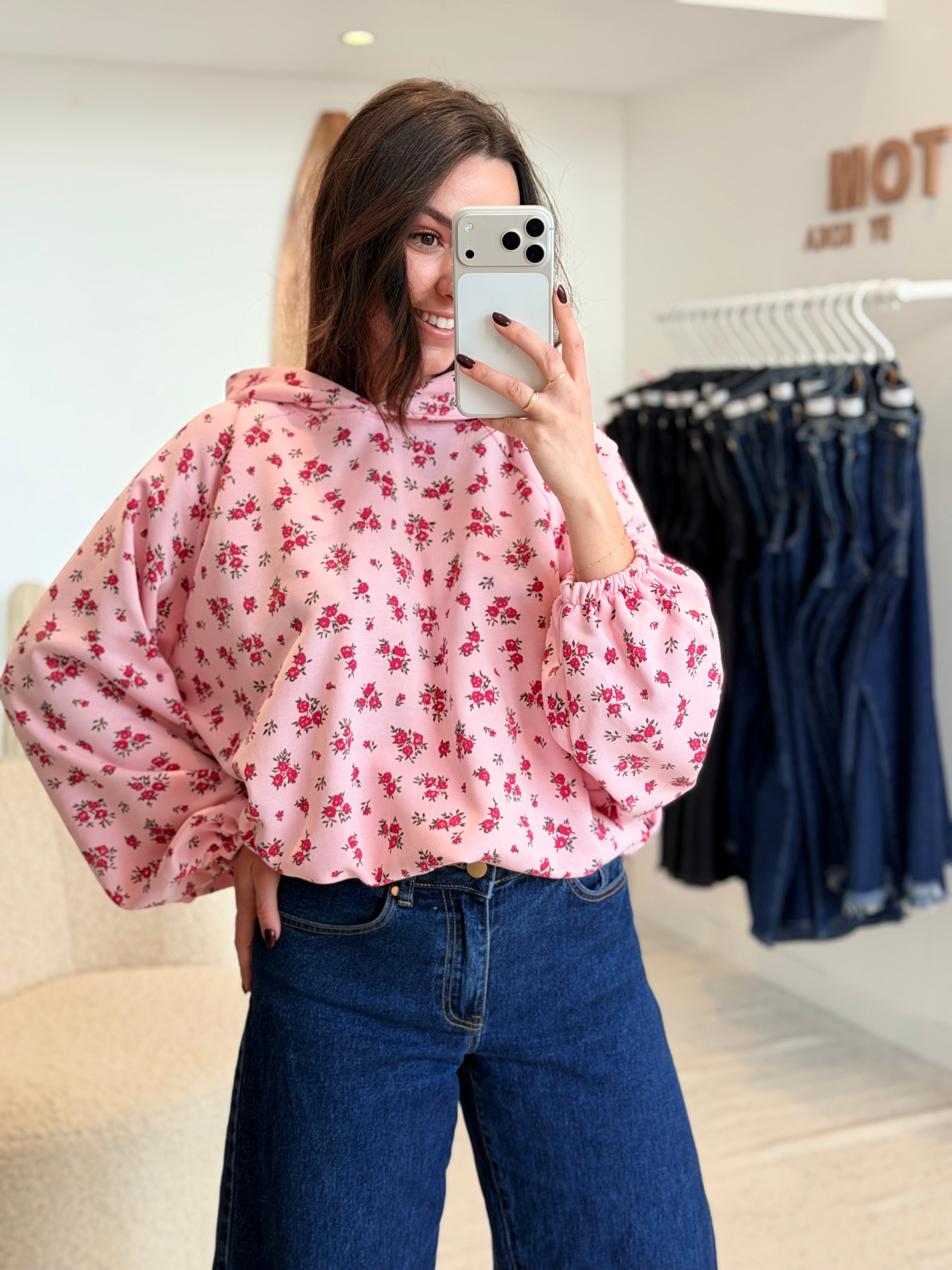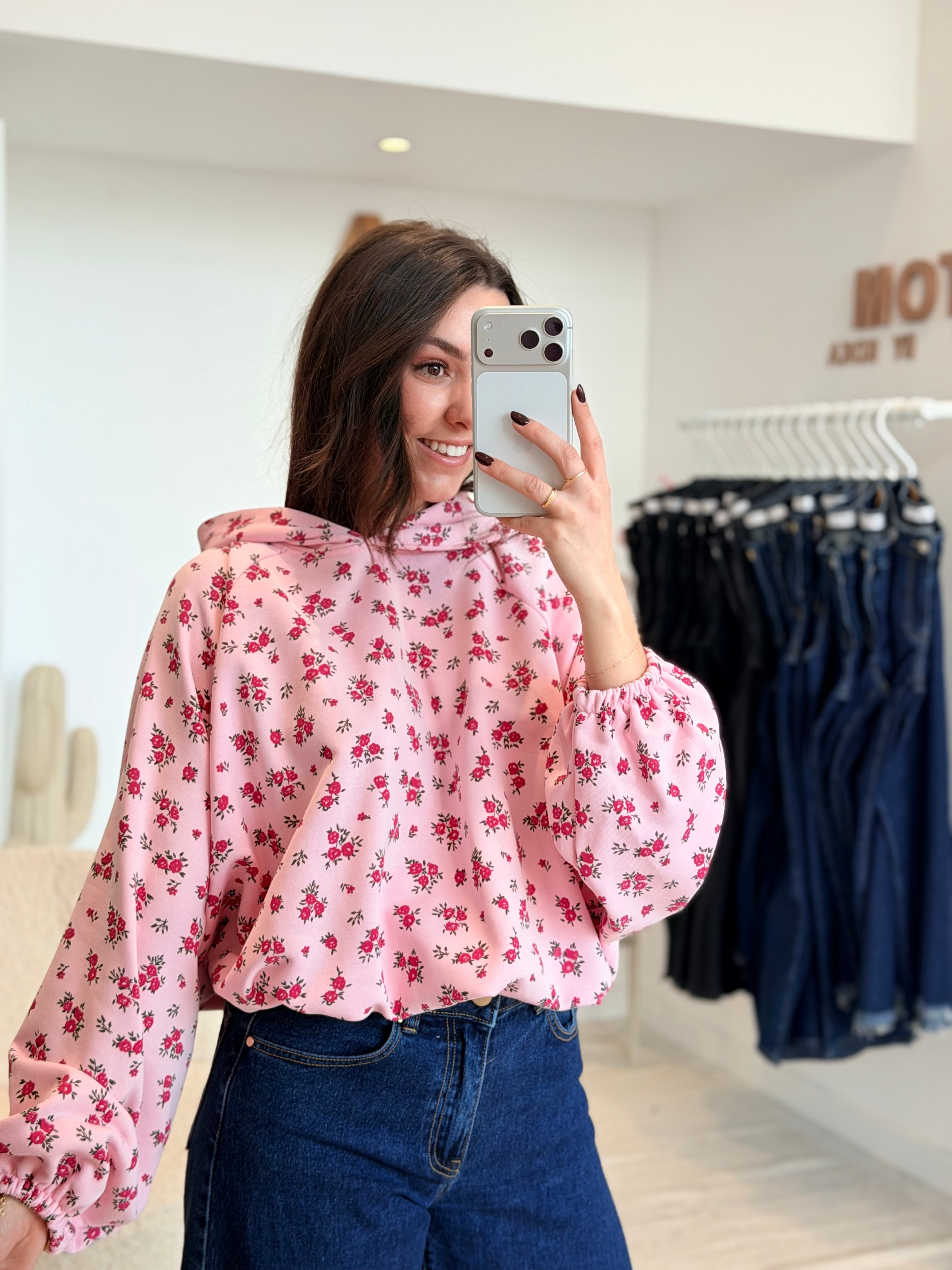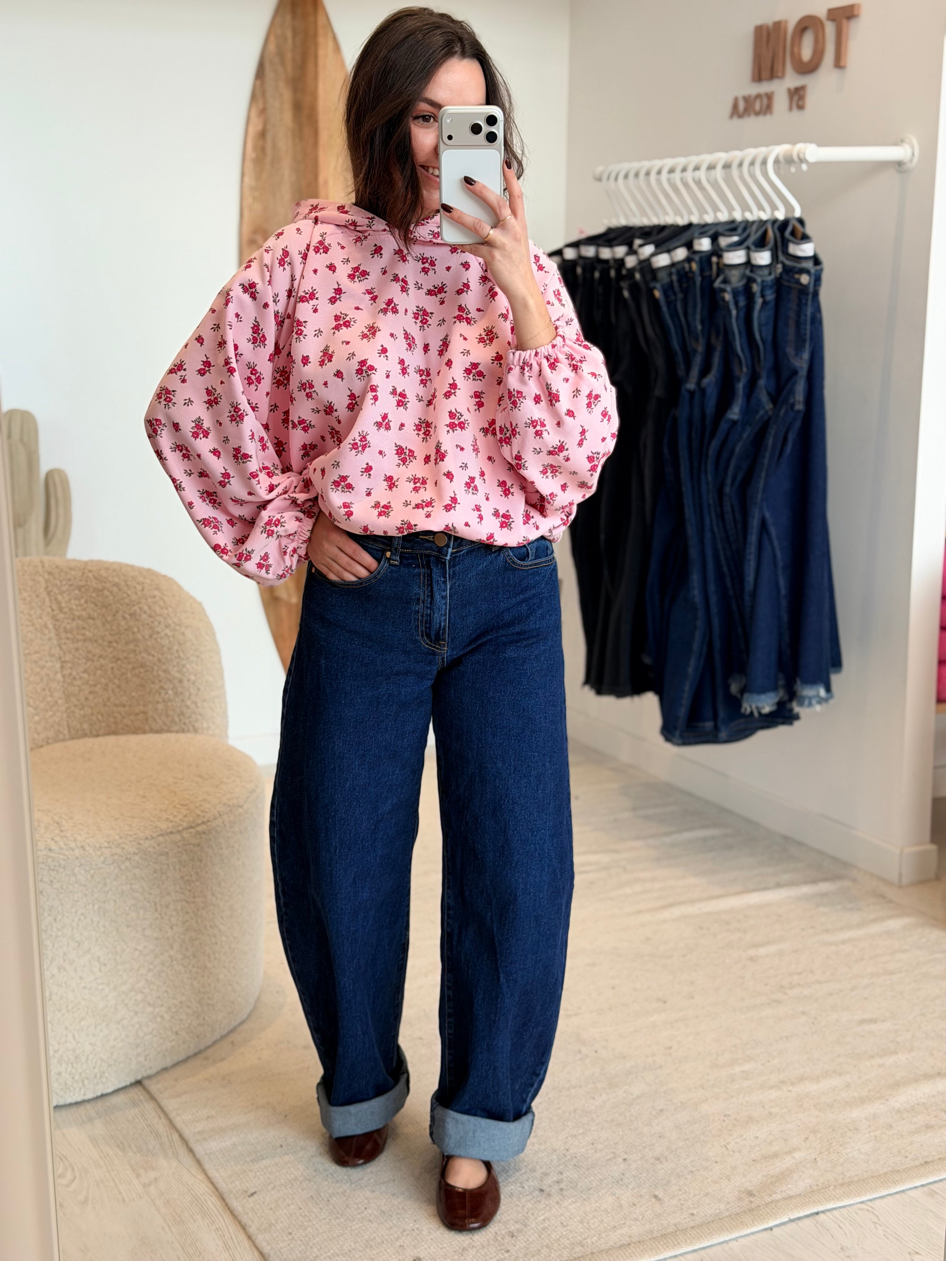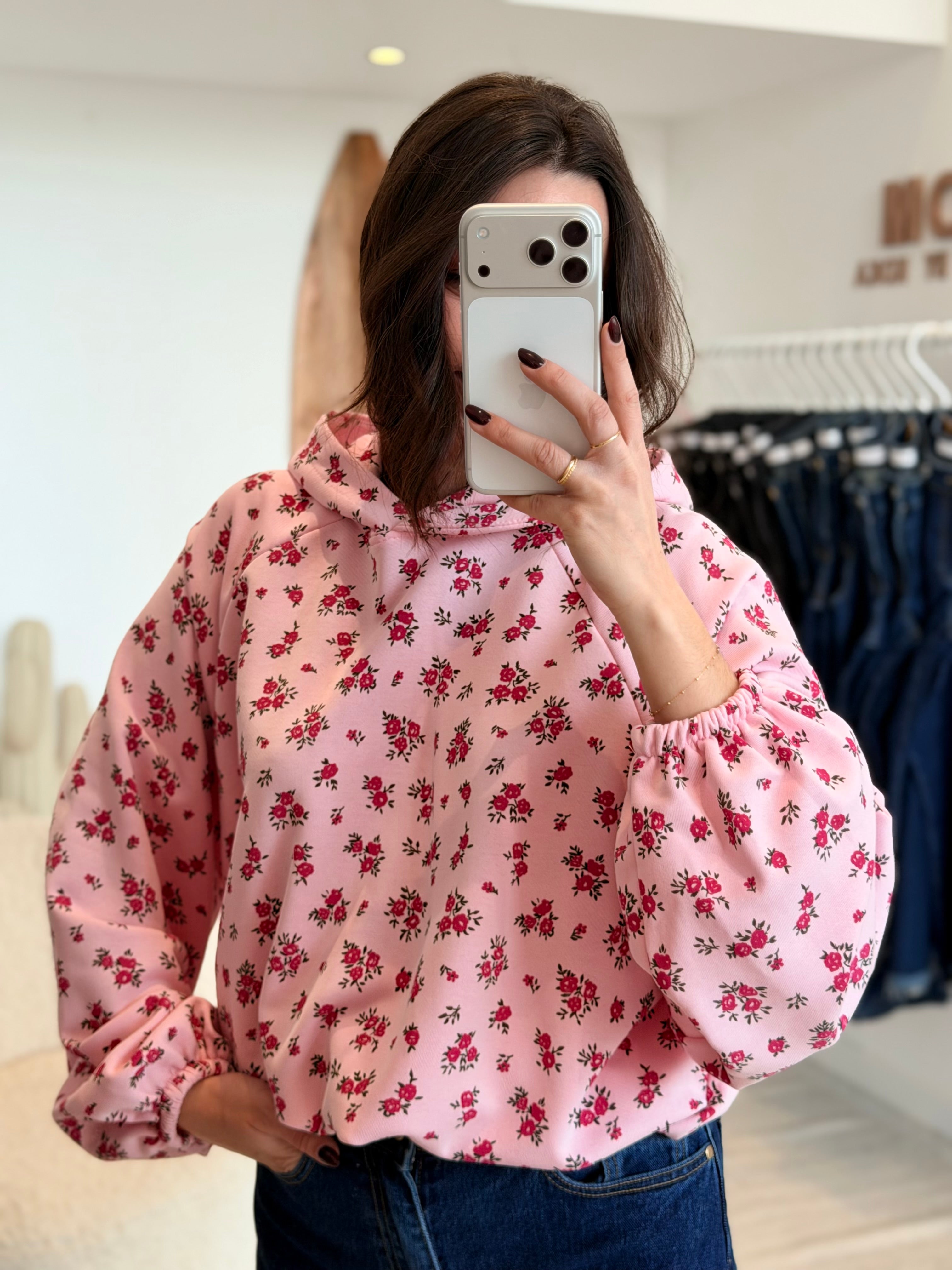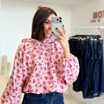 • Imprimés roses sur l'ensemble du pull