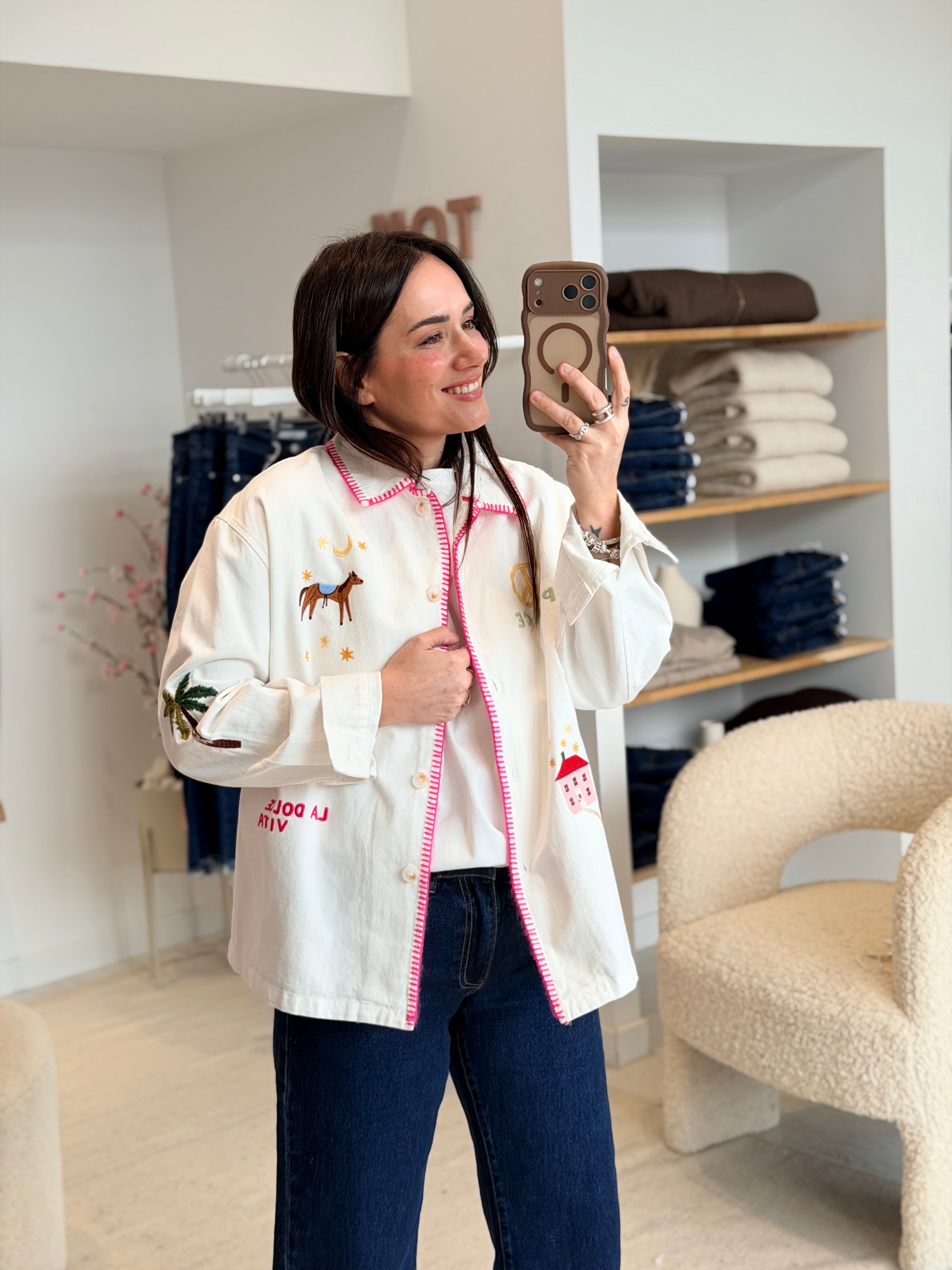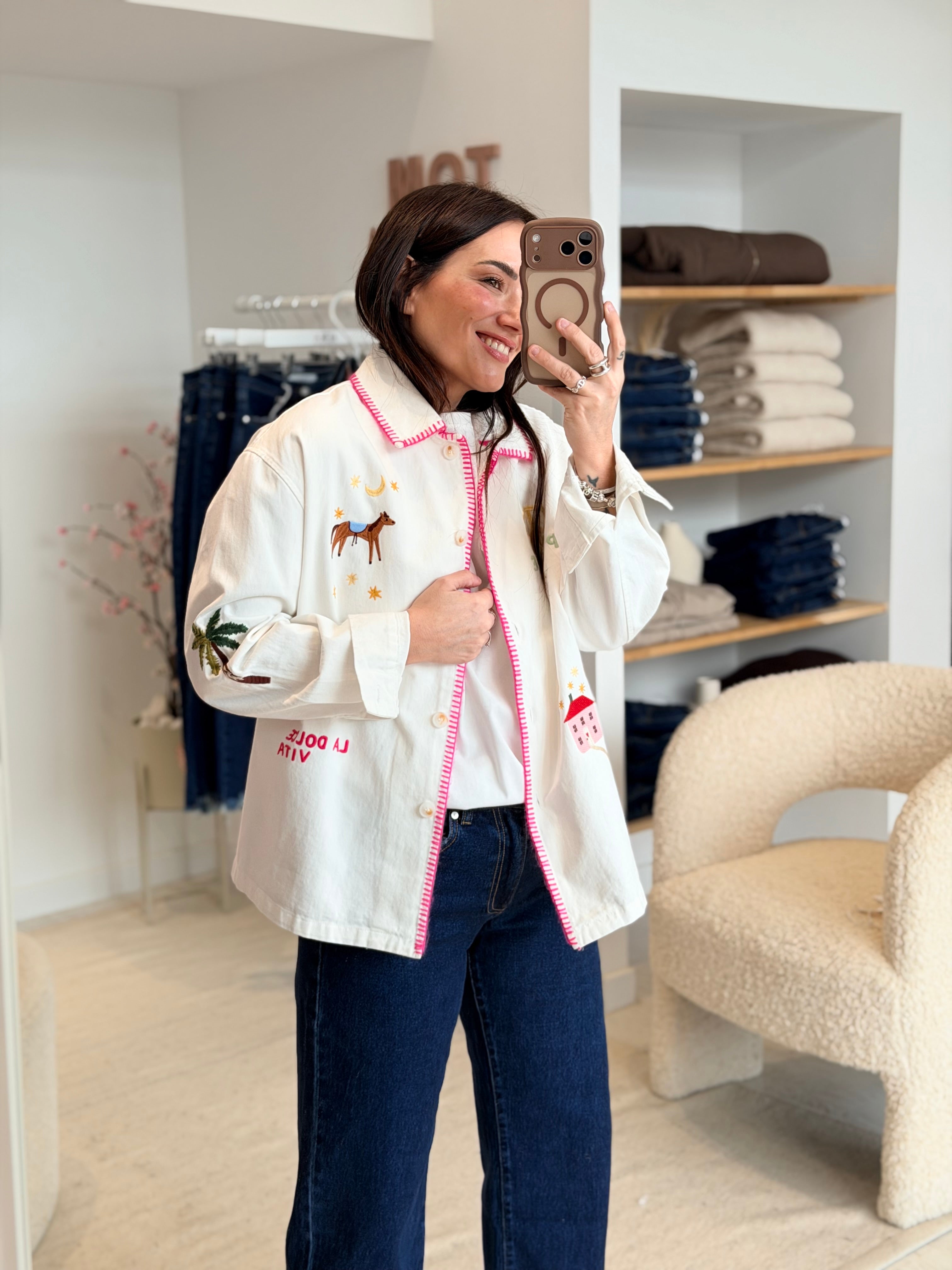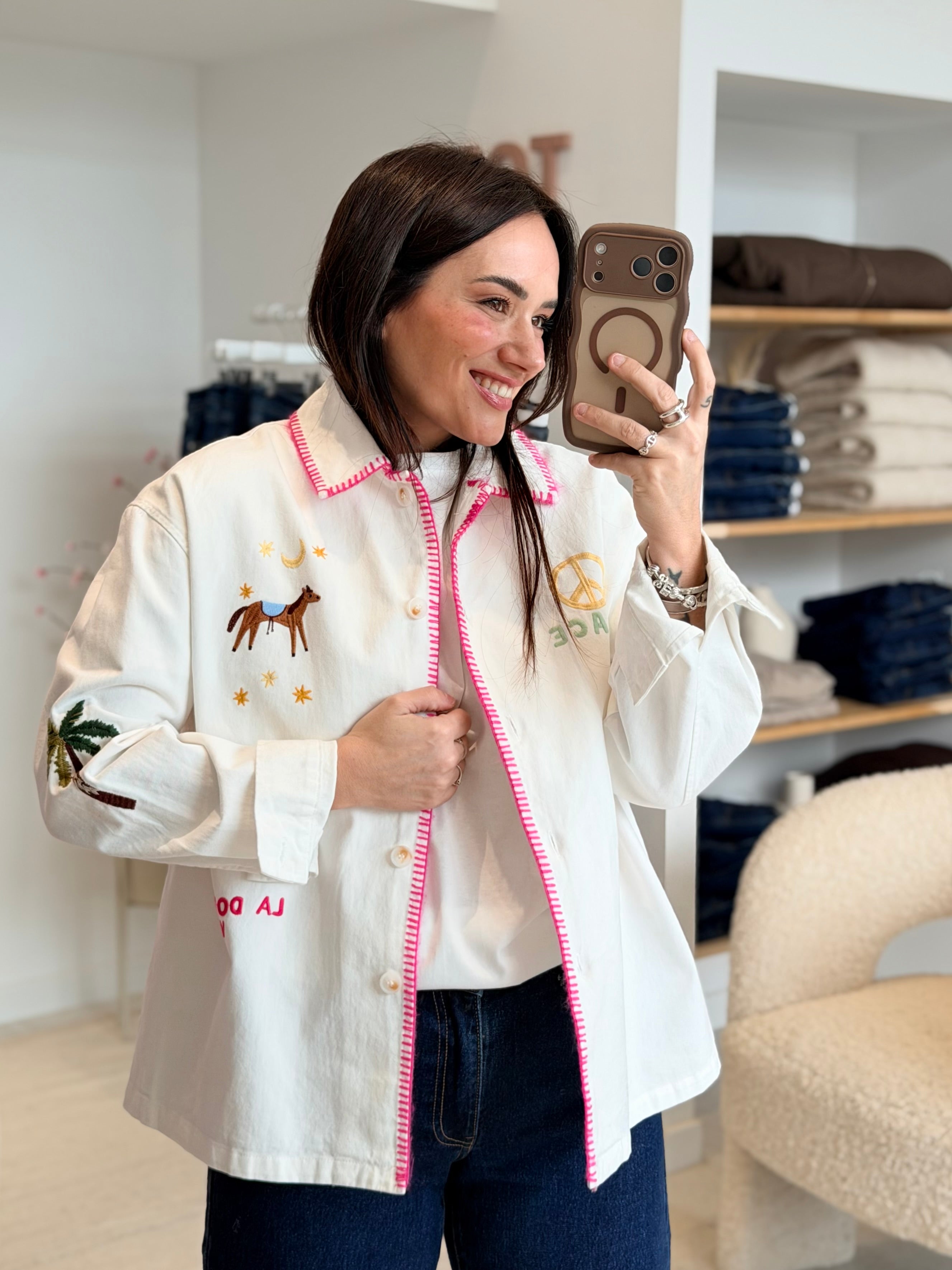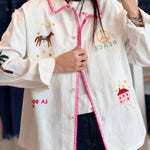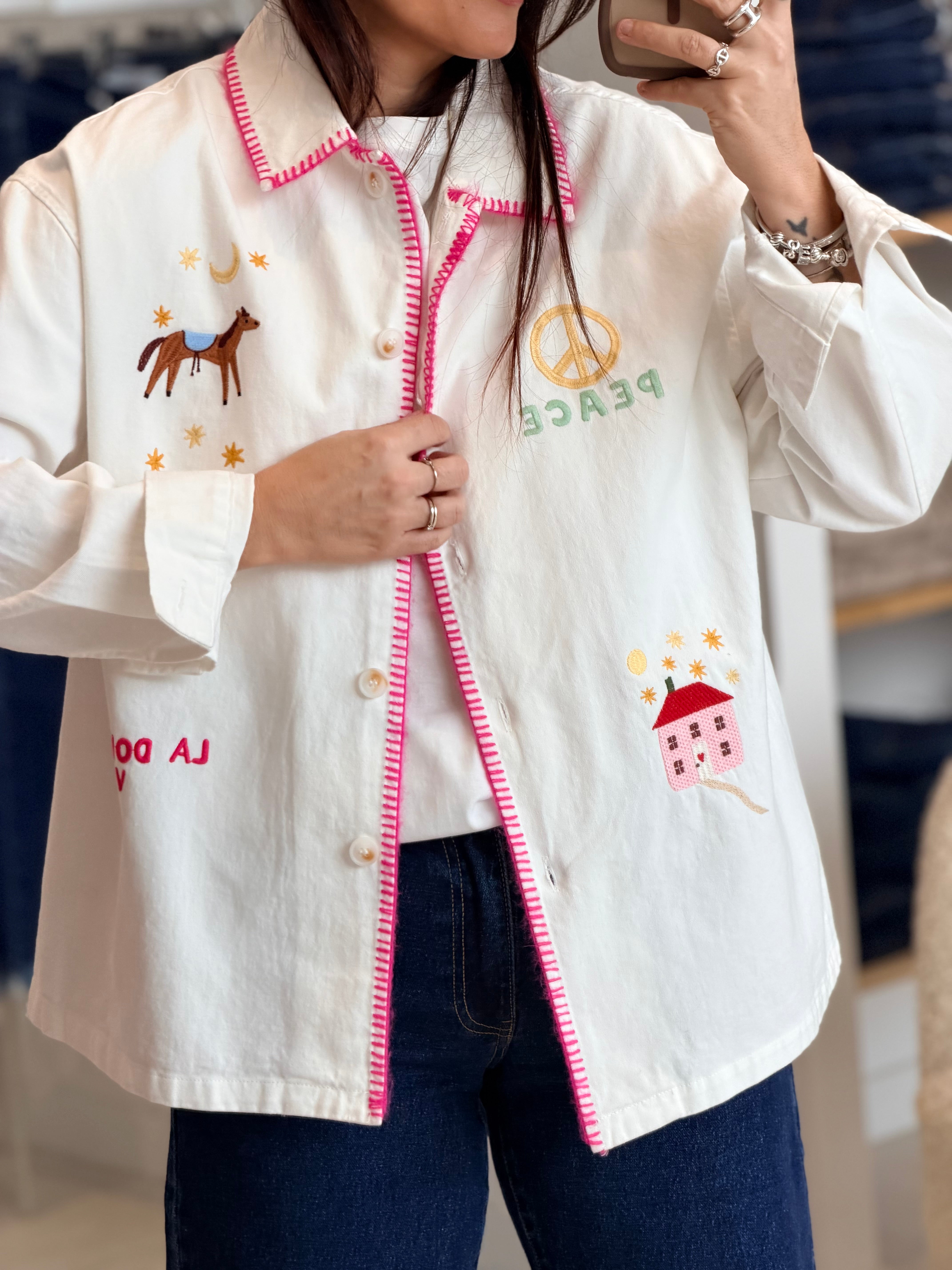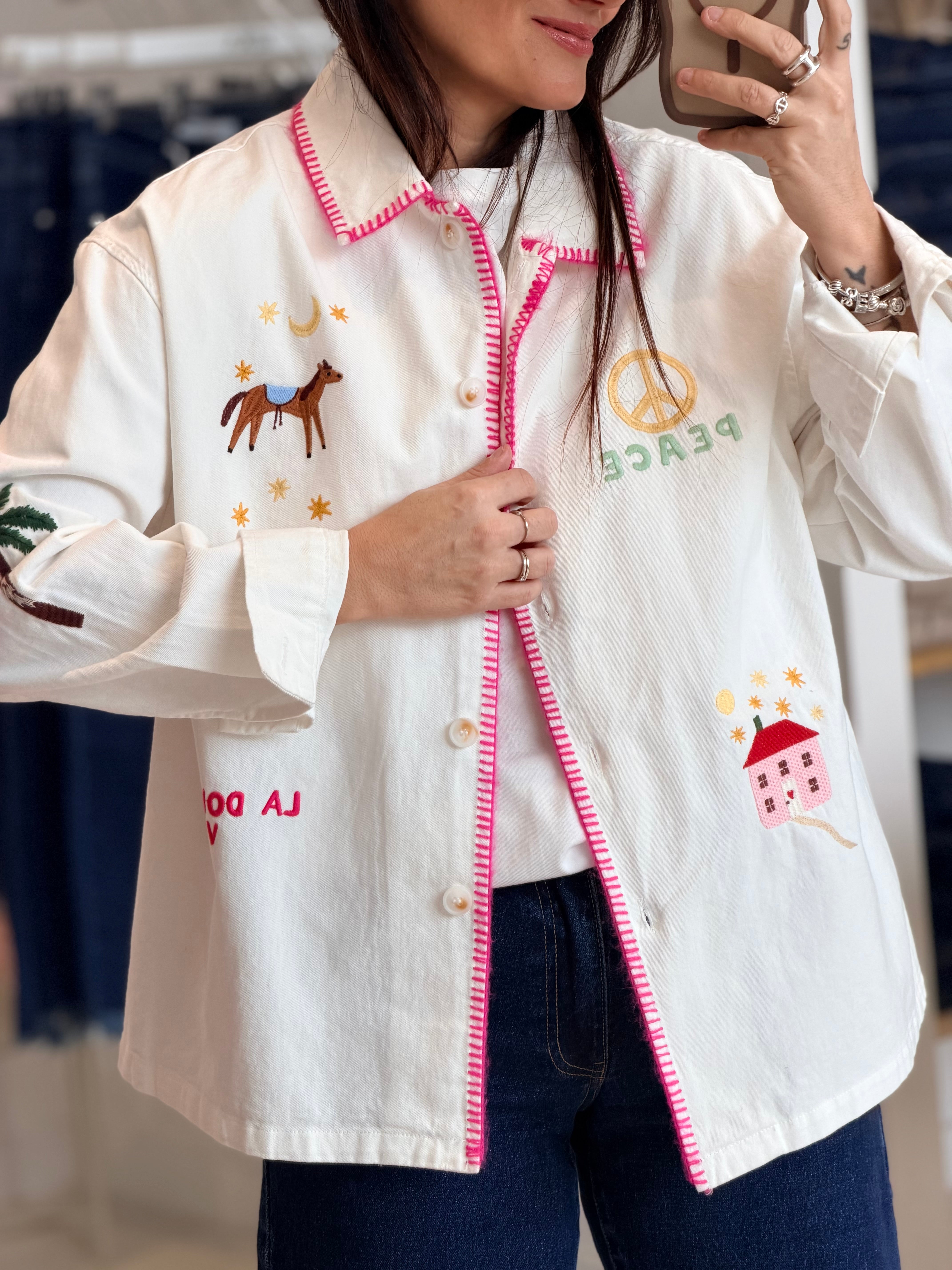 - Broderies en motifs multicolores à l'avant + manches