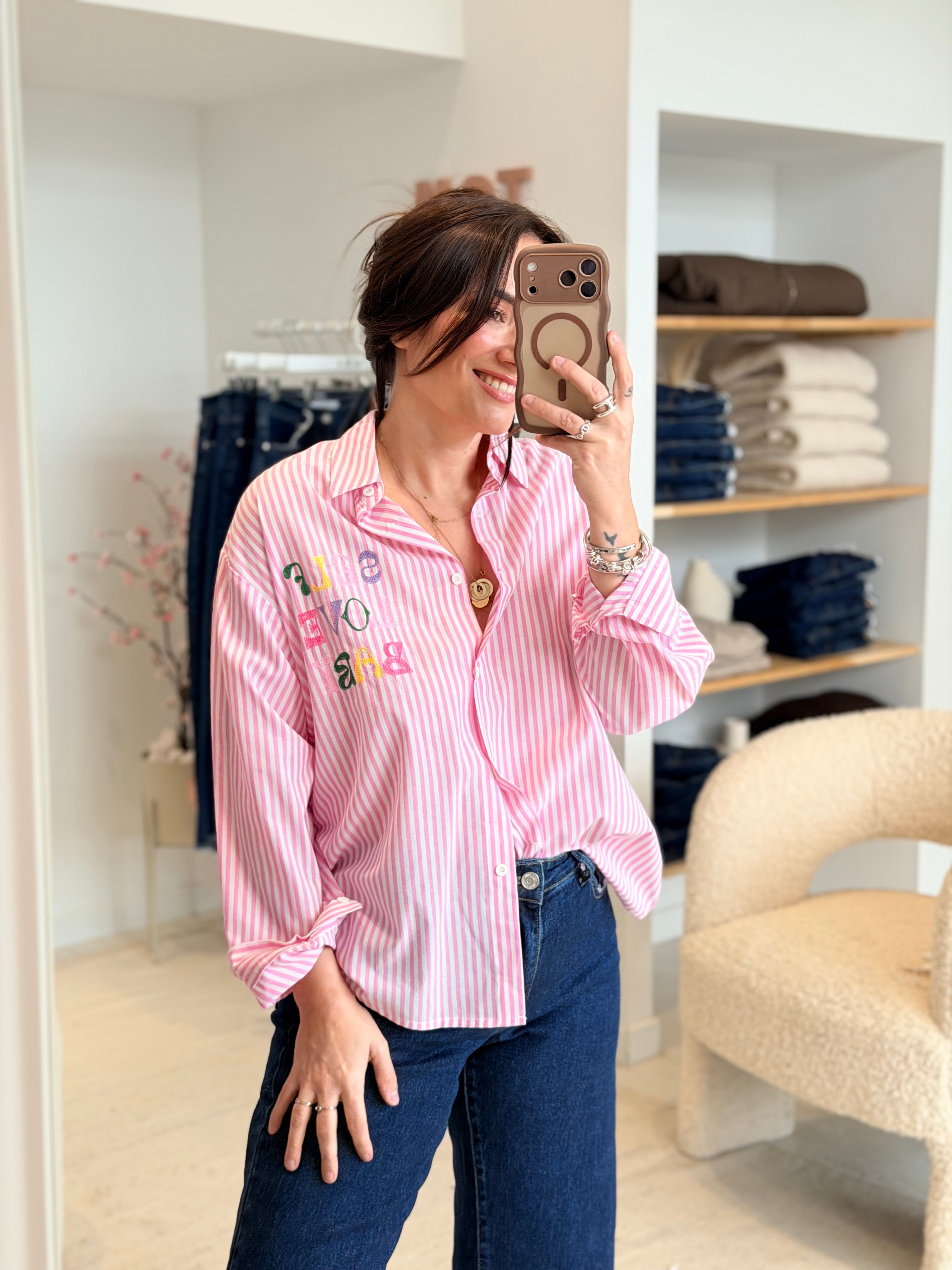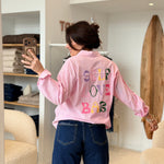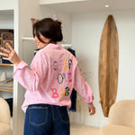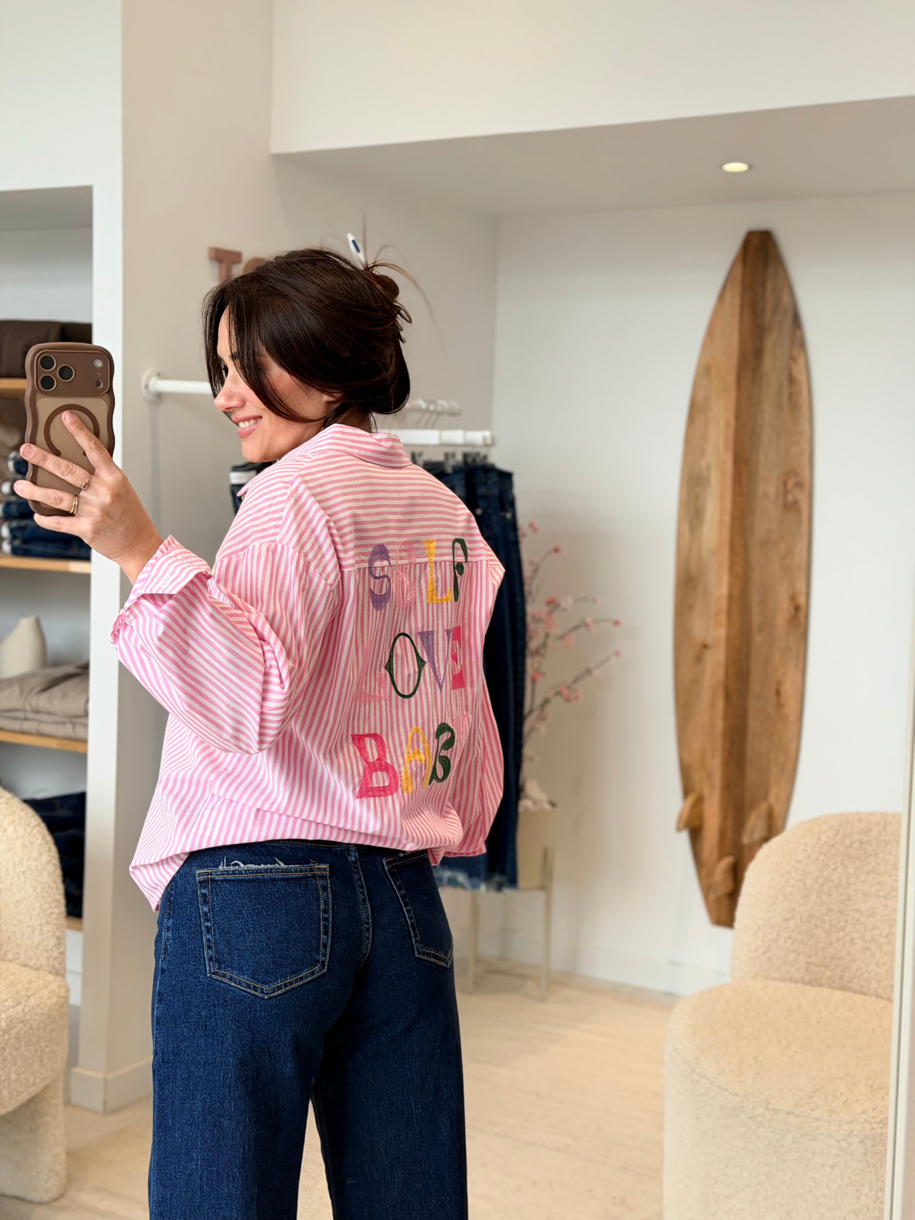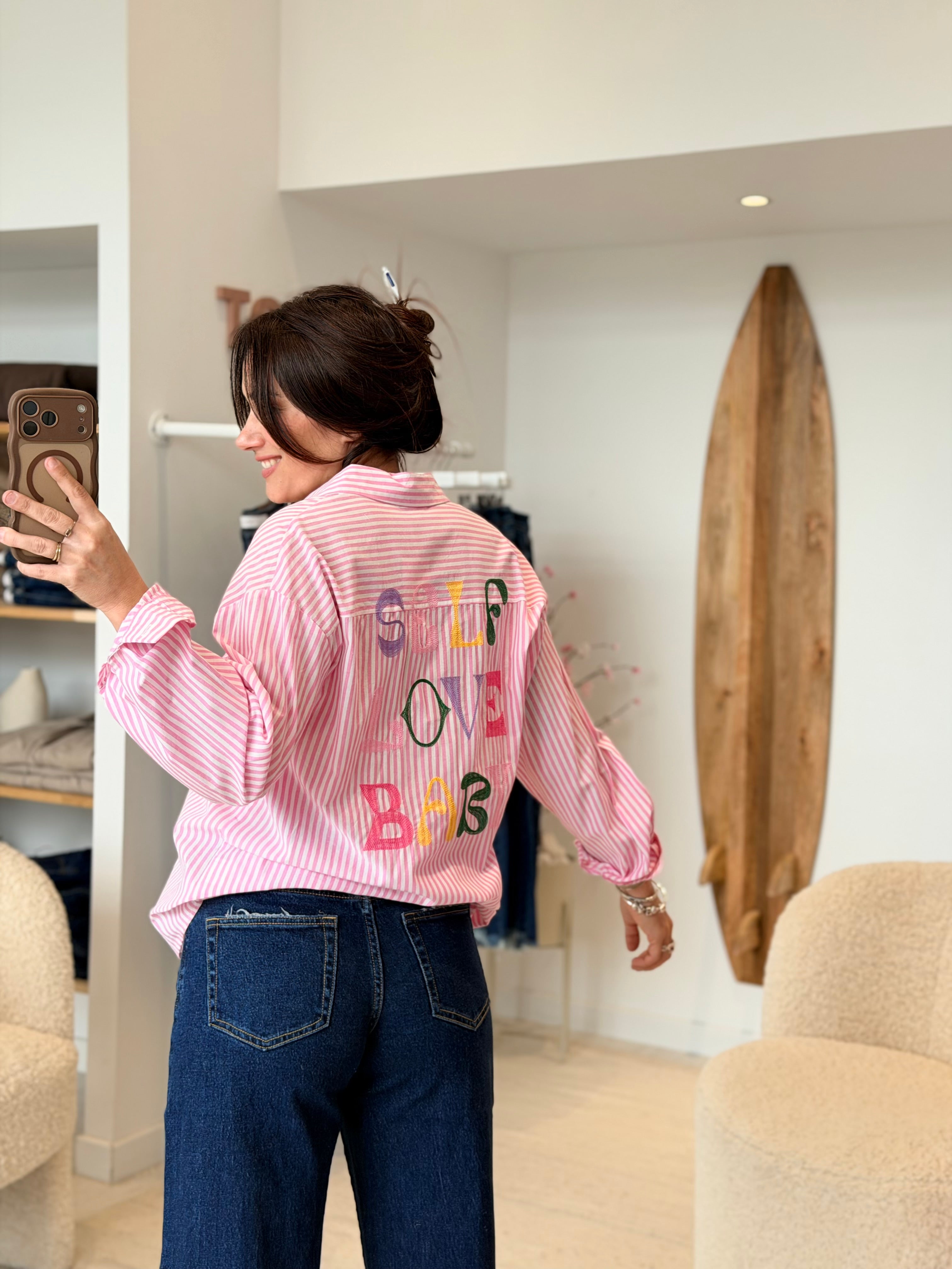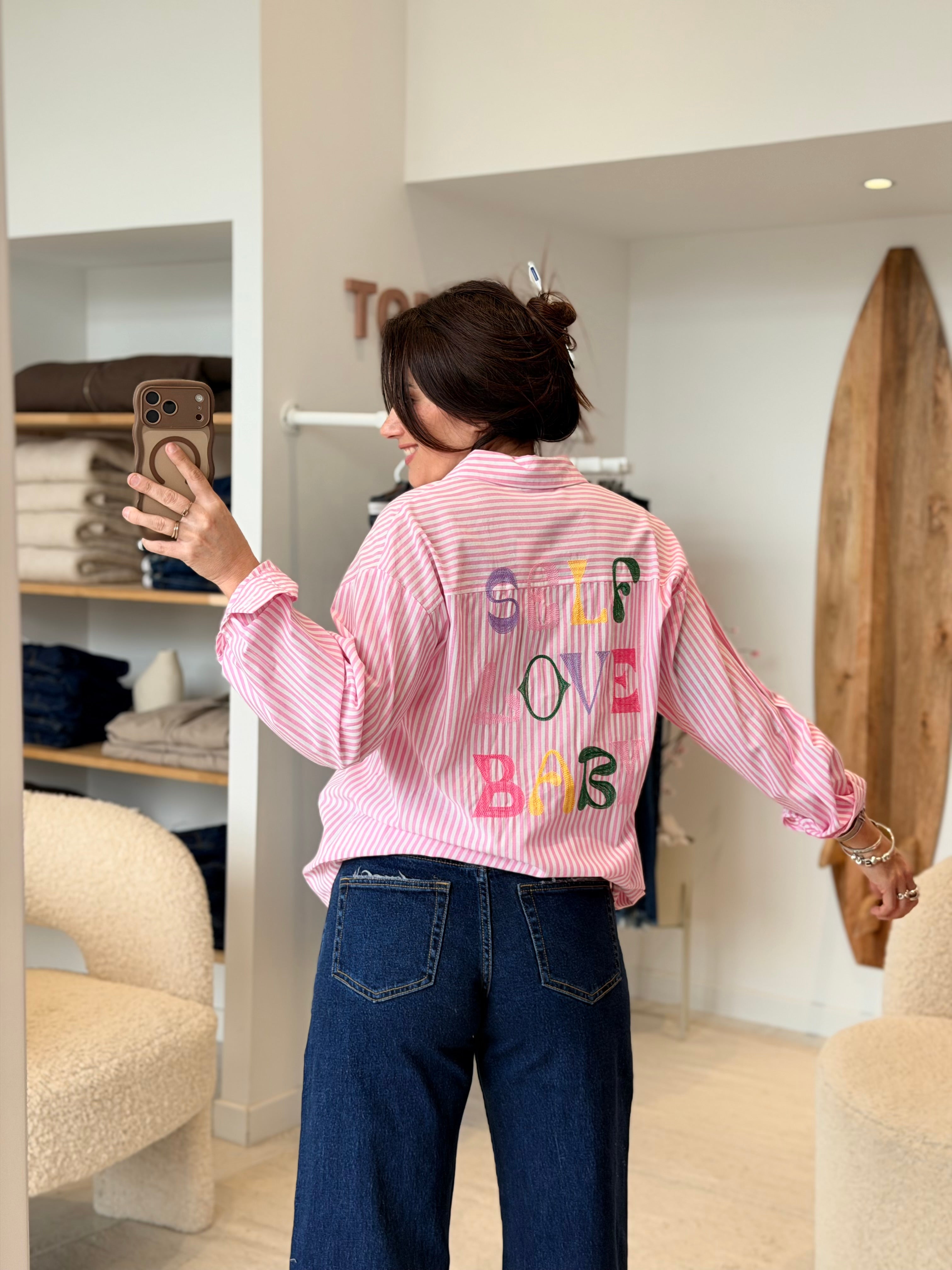 - Broderies multicolores "Self Love Baby" à l'avant et à l'arrière