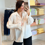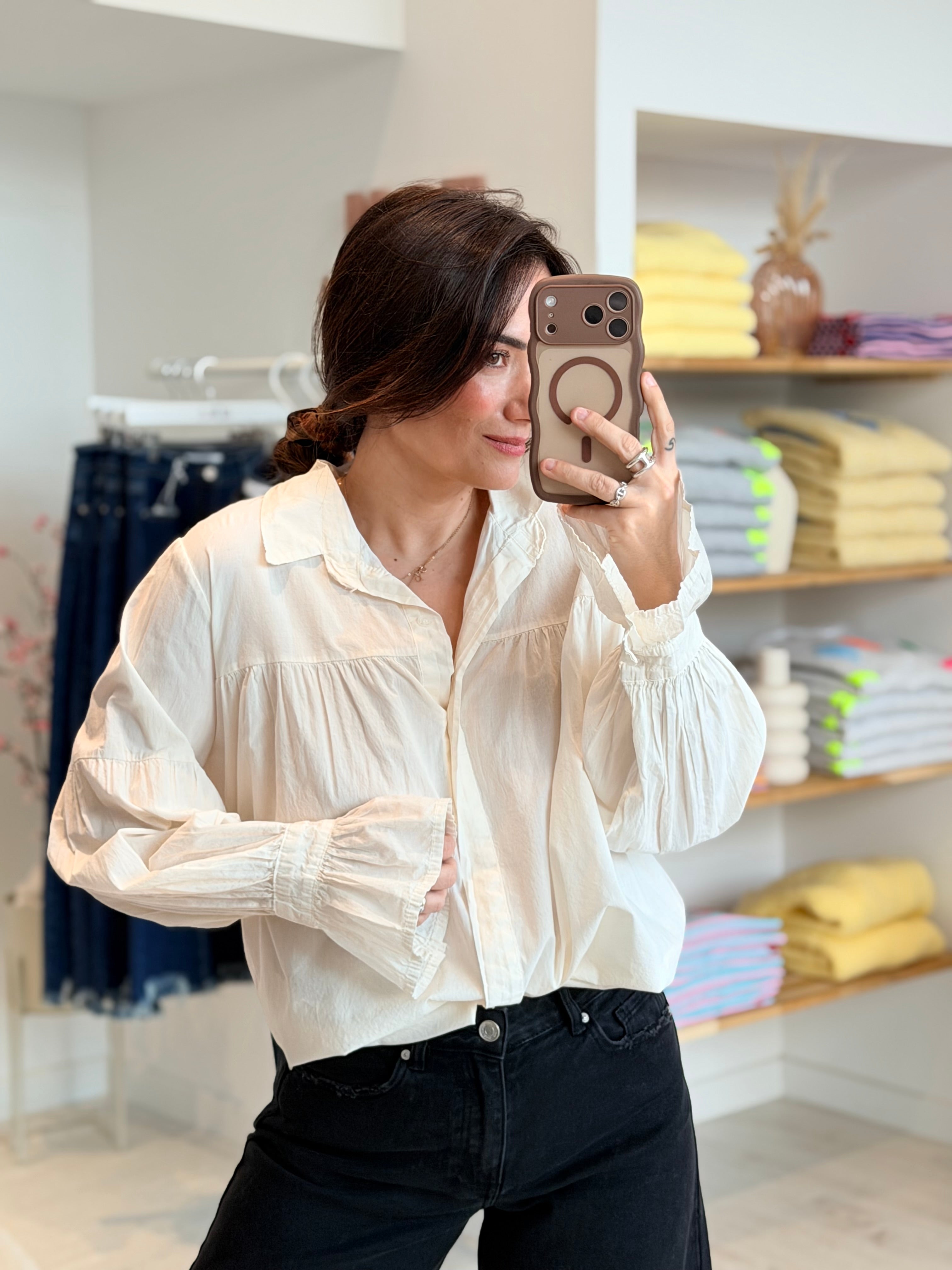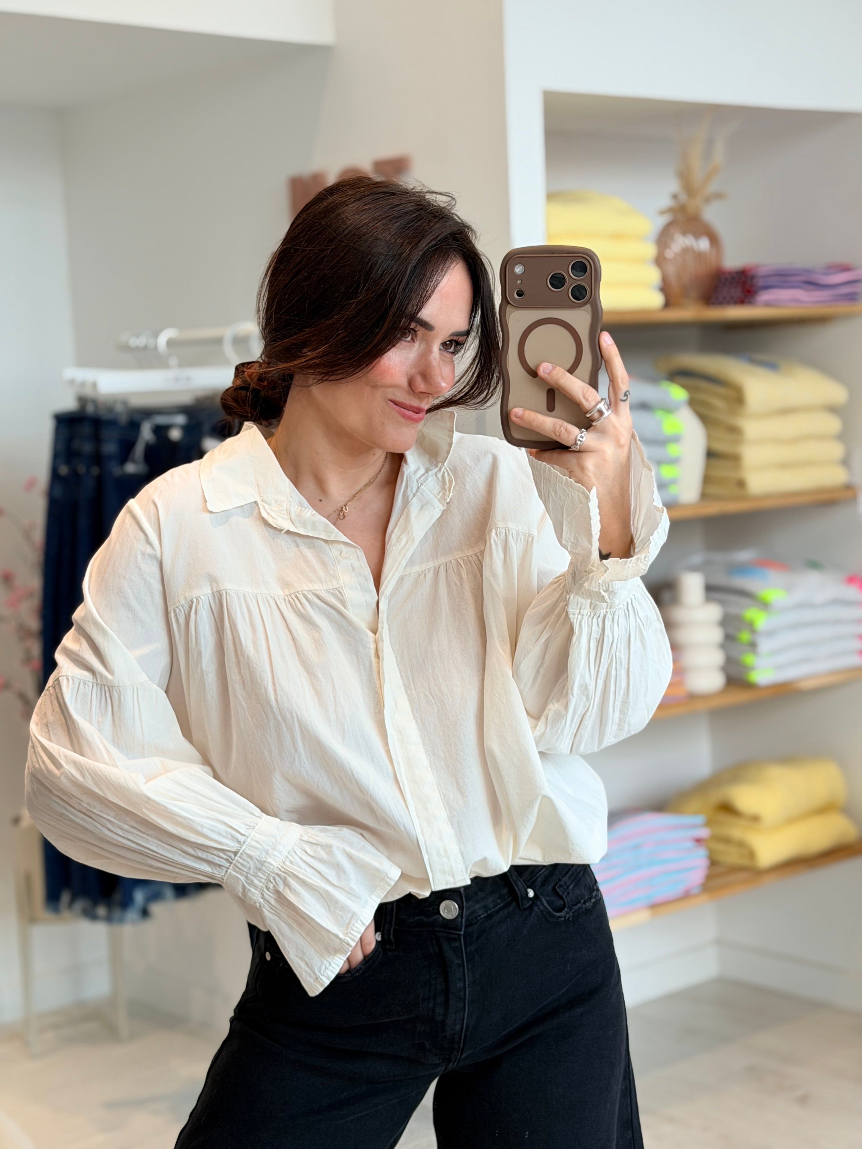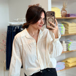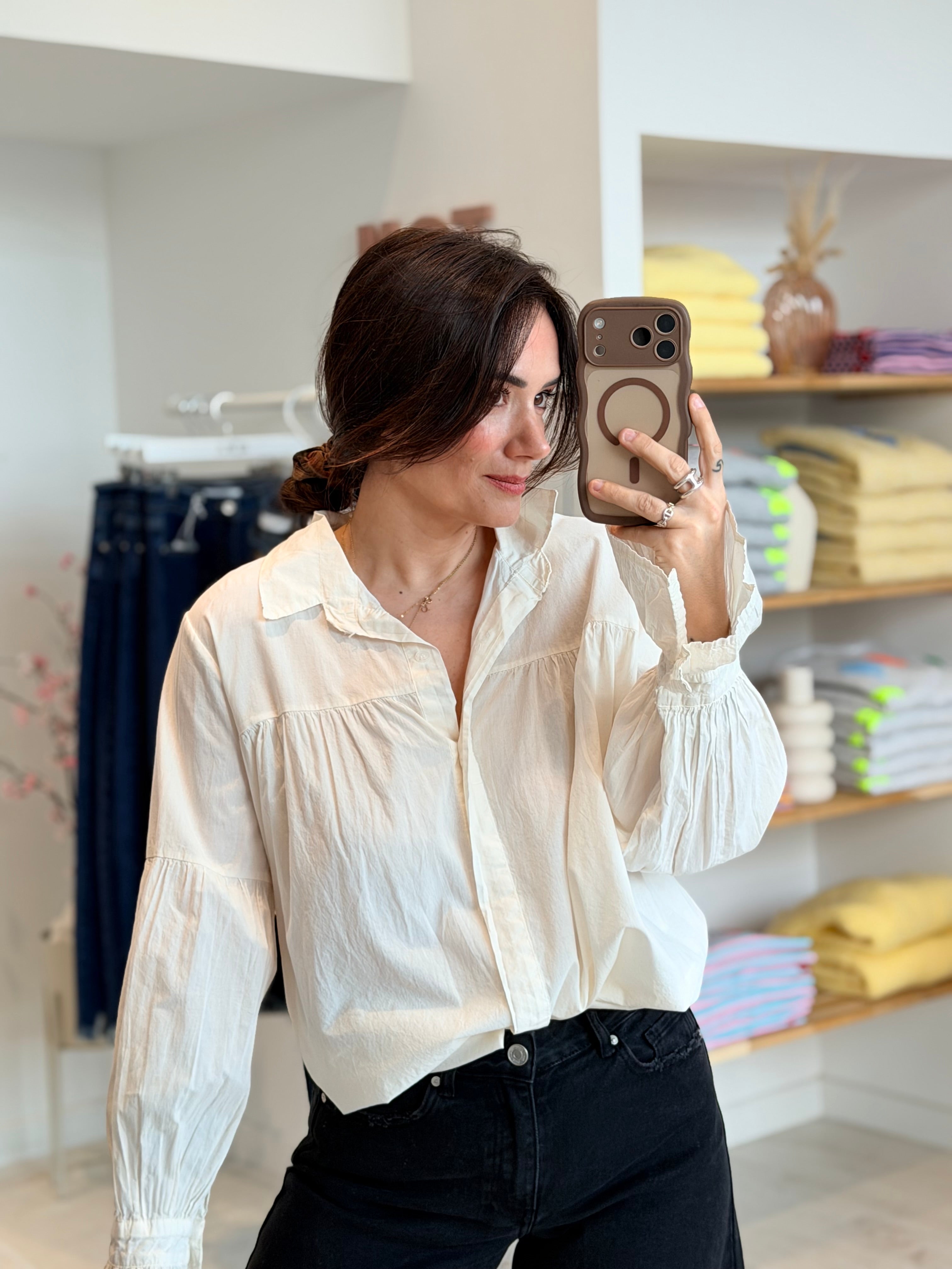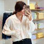 - Manches longues et larges effet "ballon" terminées par des poignets boutonnés froncés + évasés